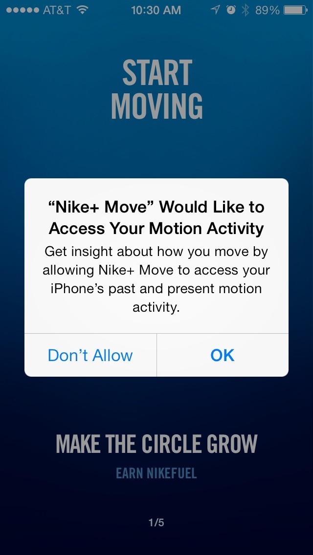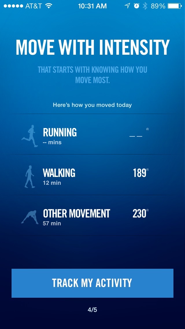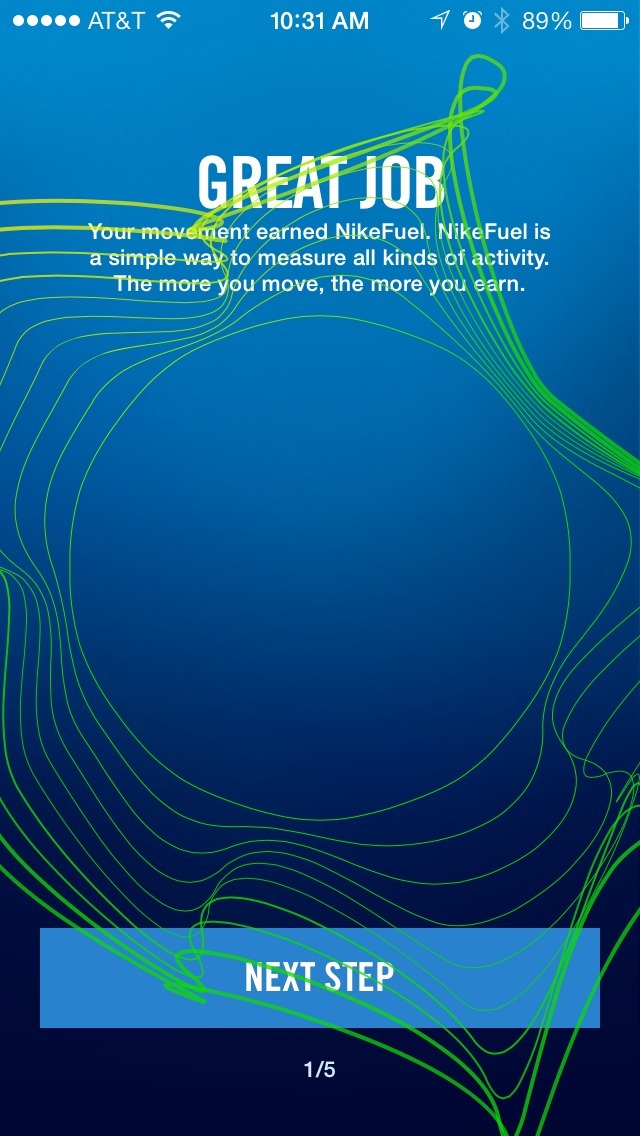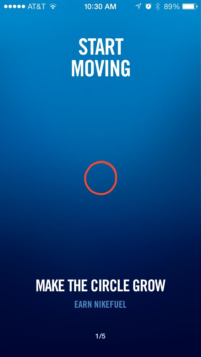 After tapping OK on this prompt, the next screen (“Start Moving”) appears to be the first in a standard walkthrough, as denoted by the “1/5” text at the very bottom. But in order to progress, one has to move the phone enough to expand the circle in the middle and earn some Nike Fuel points. This is a great sample that demonstrates what a user will experience in an everyday view of the app. It also provides users with an early success via the earned Nike Fuel.