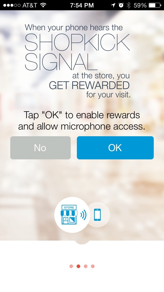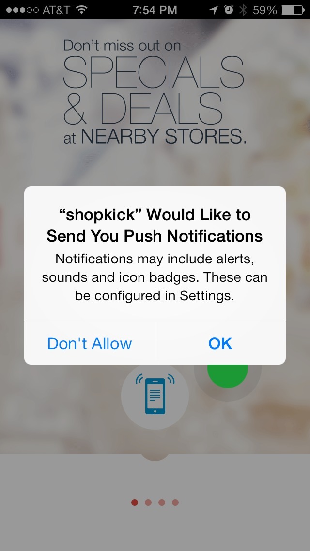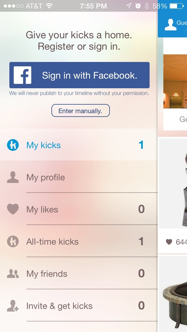 Shopkick allows users to access their app without the requirement of signing in. Non-signed-in users can view products, get shop alerts, and like items. This provides a good sample of its product offering without requiring an account.