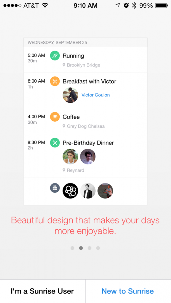 - The app doesn’t try to re-explain the mobile calendar concept; once the setup process is complete, the user is taken immediately to their calendars without needing to go through popovers or coachmarks. By leveraging a user’s existing experience with calendars on iOS, Sunrise can avoid extraneous tutorials.