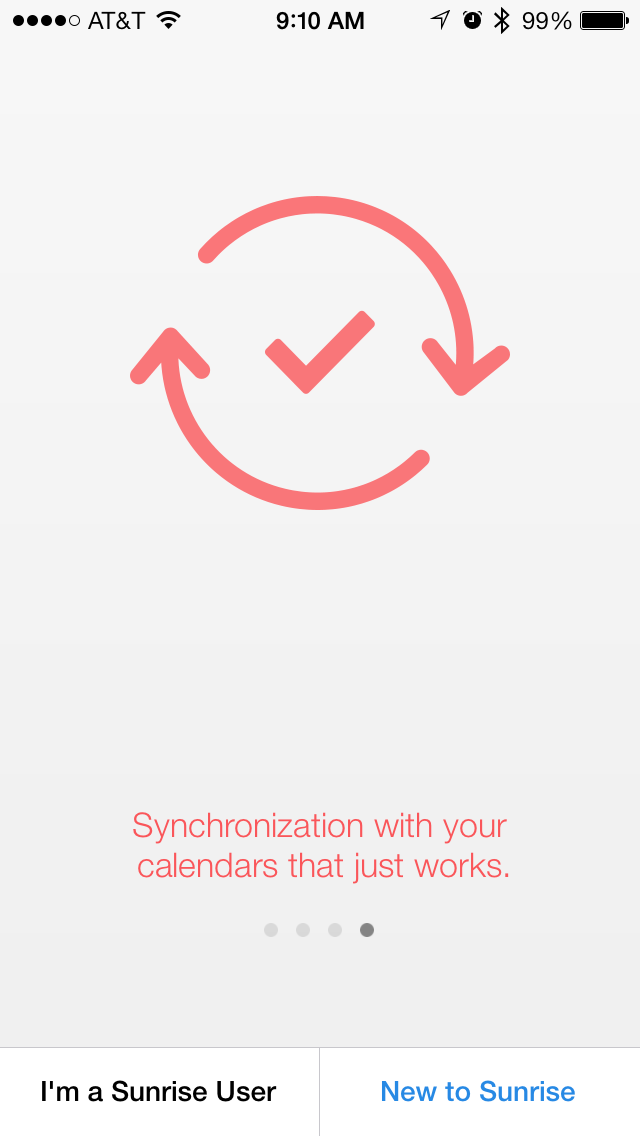 - The app doesn’t try to re-explain the mobile calendar concept; once the setup process is complete, the user is taken immediately to their calendars without needing to go through popovers or coachmarks. By leveraging a user’s existing experience with calendars on iOS, Sunrise can avoid extraneous tutorials.