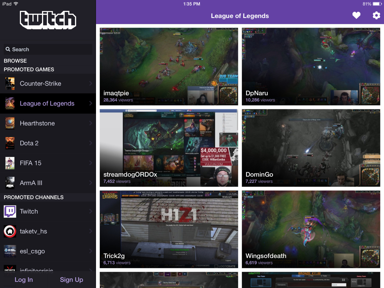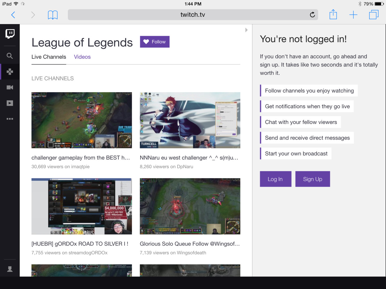 - Both the website and app give users a free sample. The new user is not required to log in or sign up in order to browse categories, watch games, or view live chat. This quickly demonstrates to the new user all the content on Twitch, better increasing the odds that she’ll be inspired to create an account–even a paid account–to unlock more features.