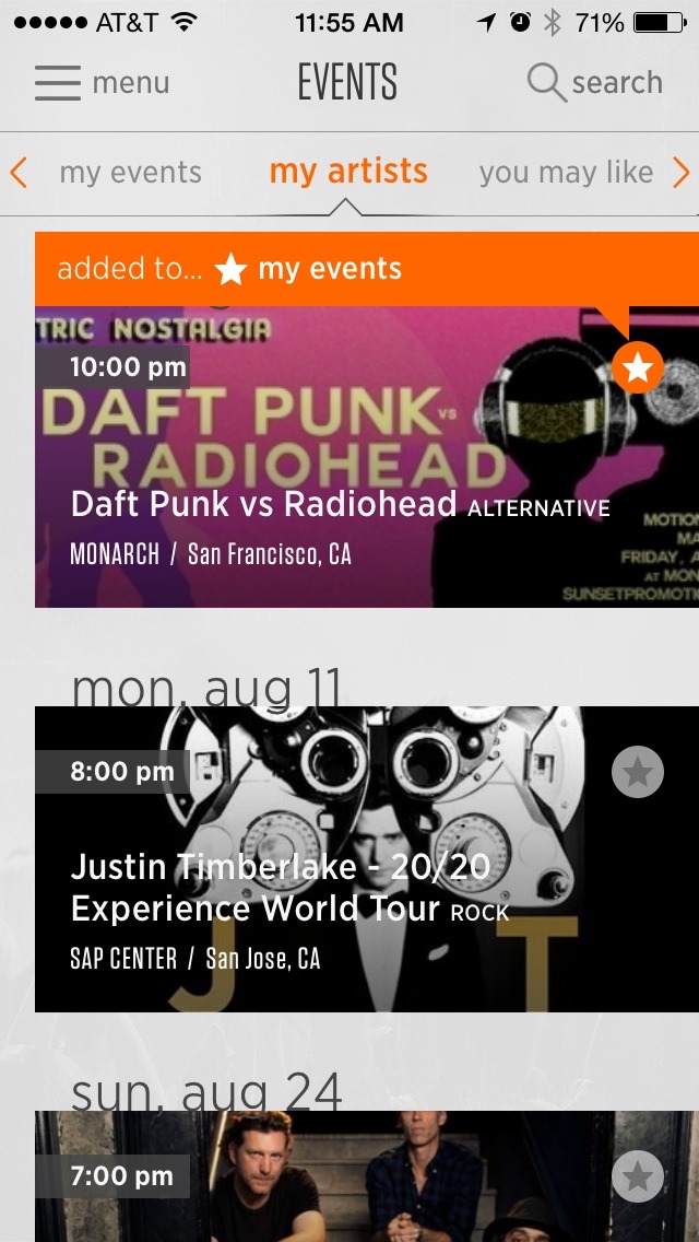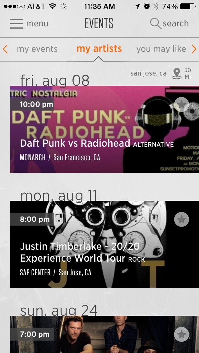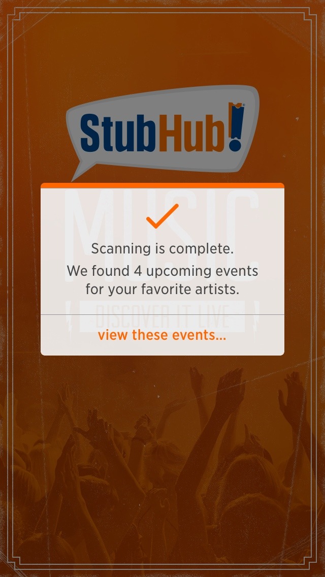 - The app doesn’t block users with an intro tour or a forced sign-up wall. Instead, the app provides an immediately relevant & focused initial experience by scanning the new user’s music library and displaying events for the artists he has on his phone.